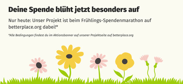Da kommt eine gute Nachricht gerade recht – heute läuft der betterplace Frühlings-Spendenmarathon 2026: betterplace stellt ein Aktionsbudget von 10.000 € zur Verfügung, das anteilig an die Projekte mit den größten, an diesem Tag erreichten Spendensummen vergeben wird. Je mehr und je größere Einzelspenden wir erhalten, desto größer ist unsere Chance auf eine zusätzliche Förderung aus dem Aktionsbudget. Das können wir gerade zum Einsatzstart 2026 gut gebrauchen!
