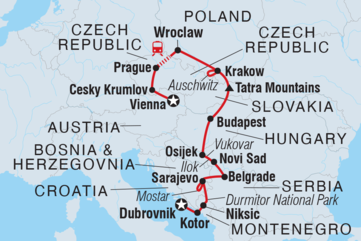Reise von Wien nach Dubrovnik auf diesem 29-tägigen Abenteuer durch Österreich, die Tschechische Republik, Polen, die Slowakei, Ungarn, Serbien, Bosnien-Herzegowina, Montenegro und Kroatien. Entdecke eine Region, in der die Vergangenheit in Form von Alpenstädten, mittelalterlichen Schlössern und heiligen Klöstern noch immer ihren Zauber ausübt. Besuche den Stephansdom in Wien, wandere durch das Staatliche Museum Auschwitz-Birkenau und erkunde den Durmitor-Nationalpark, der zum UNESCO-Weltkulturerbe gehört. Streife durch das Viertel Zemun, wandere im Tatra-Gebirge und mache einen Tagesausflug nach Mostar. Diese Reise führt dich durch neun Länder und zeigt dir das Beste von Mitteleuropa, während du viel Zeit hast, die Kultur und die Menschen auf deine eigene Weise zu erleben.