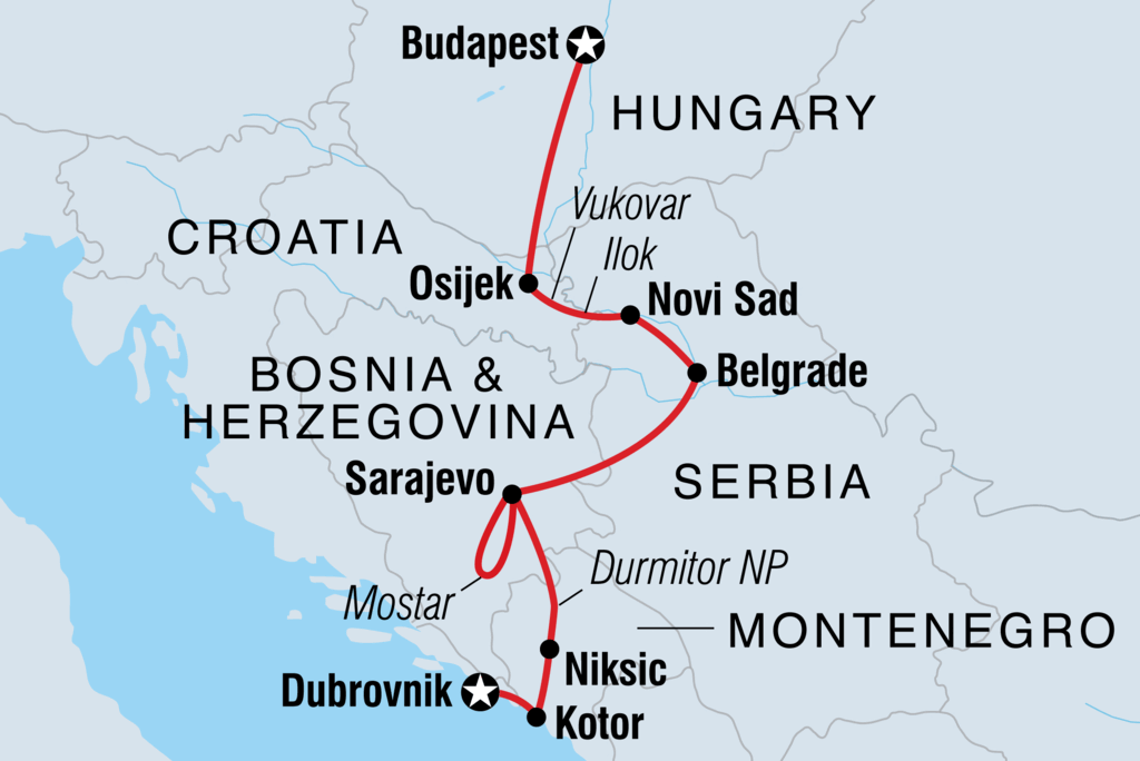 Reise auf dieser 15-tägigen Abenteuerreise durch den Balkan. Du beginnst in Budapest, überquerst die Kettenbrücke, nimmst an einer geführten Tour durch den Kopacki Rit Naturpark teil und tanzt die Nacht durch in Belgrad. Schlendere durch die Altstadt von Sarajevo aus dem 15. Jahrhundert, wandere durch den Durmitor-Nationalpark und beobachte die berühmten Brückenspringer von Mostar, die sich von den Steinen von Stari Most stürzen. Erfahre mehr über die Geschichte Sarajevos als belagerte Stadt, fahre mit der Seilbahn zur Burg Buda und mache einen Tagesausflug nach Zemun.