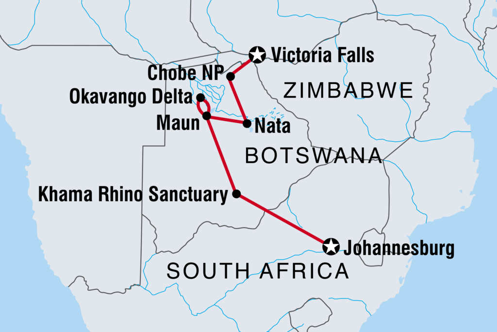 Erlebe auf dieser zehntägigen Überlandreise die unglaublichen Wasserfälle, Flüsse und Kanäle des südlichen Afrikas. Fahre mit dem Kanu die üppigen Wasserwege des Okavango-Deltas hinunter, beobachte Flusspferde, die sich an den Ufern des Chobe-Flusses tummeln, mache eine Kreuzfahrt bei Sonnenuntergang, um exotische Vögel zu beobachten, erlebe die Fata Morgana der Makgadikgadi-Salzpfannen und das tosende Wildwasser der Victoriafälle. Nach der Fahrt im Mokoro verbringst du eine Nacht im Camp in der abgelegenen Okavango-Wildnis und schläfst zu den ungestörten Klängen der Wildnis ein. Frühmorgendliche Pirschfahrten, um Afrikas ikonische Wildtiere zu entdecken, und fachkundige Führer mit all ihrem Wissen machen diese Reise zu einem einmaligen Erlebnis.