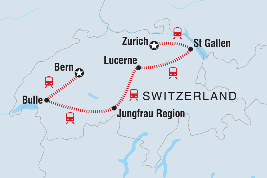 <Hoi! Willkommen in der Schweiz. Dein Abenteuer beginnt mit einem Begrüßungstreffen um 18 Uhr heute Abend in Zürich. Wenn du früher ankommst, kannst du die Großmünsterkirche besichtigen, an der Promenade des Zürichsees spazieren gehen oder deine Naschkatzen mit einer Führung und Verkostung im Lindt Home of Chocolate Museum verwöhnen. Nach deinem Treffen begleitest du deinen lokalen Leiter auf einem Orientierungsspaziergang. Später lernst du deine Mitreisenden vielleicht bei einem Abendessen in einem lokalen Restaurant kennen.
