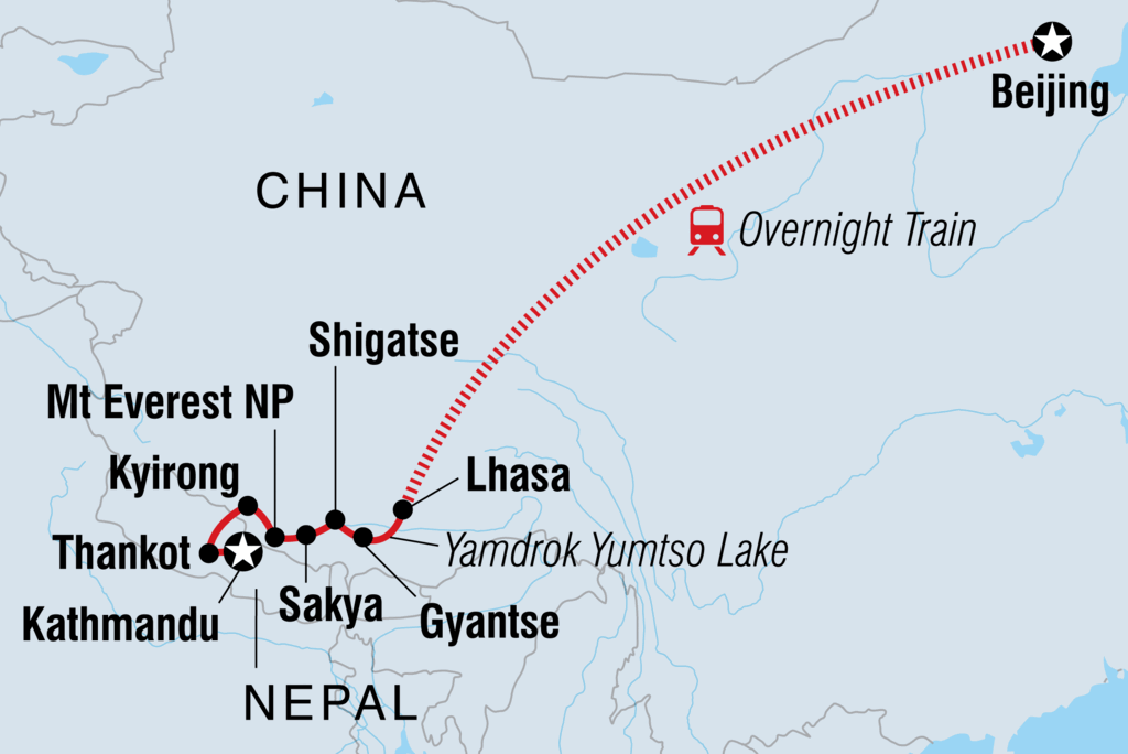 Begib dich auf eine epische 5000-km-Überlandreise vom kaiserlichen Peking durch das mystische Land Tibet bis zu Nepals kompakter Hauptstadt Kathmandu. Erlebe eine der großartigsten Zugreisen der Welt, entdecke die Hochlandstadt Lhasa und besuche das höchste Kloster der Welt im Herzen des Himalayas. Du wirst zahlreiche Tempel, göttliche Landschaften und einen unschlagbaren Blick auf den Mount Everest vorfinden. Diese aufschlussreiche Reise zum Dach der Welt, bei der die buddhistischen Kulturen der Vergangenheit und Gegenwart gefeiert werden, ist einfach unvergesslich.