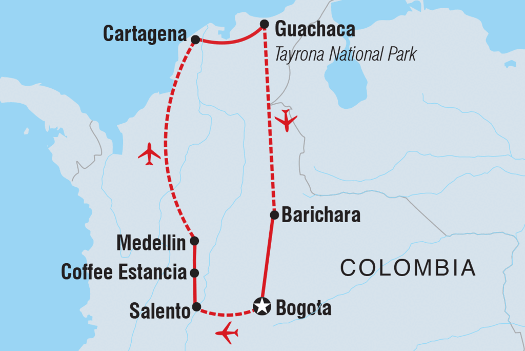 Entdecke die Geschichte und Traditionen der kolumbianischen Dörfer und die einheimische Flora und Fauna auf dieser 15-tägigen Reise durch Berge, Städte und Strände. Mach dich auf in das ruhige Hochland von Kolumbiens berühmter Kaffeeregion und lerne die Geschichten und die Kultur kennen, die in den üppigen Tälern und historischen Städten dieser Region stecken. Verliebe dich in das Herz Bogotas, faulenze an den palmengesäumten Stränden der Karibik und treffe auf Einheimische, die Gastfreundschaft neu definieren. Beende deine Reise in Cartagena, einer von der UNESCO zum Weltkulturerbe erklärten Stadt mit Festungen, einer lebhaften Plaza, die zum Beobachten von Menschen einlädt, und vielen leckeren lokalen Gerichten, die du probieren kannst.