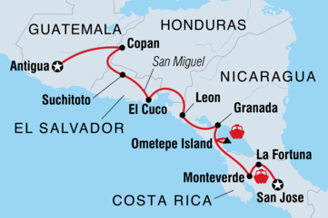 Tropische Nebelwälder mit Dschungelmelodien und einheimischer Tierwelt, riesige Süßwasserseen und aktive Vulkane, historische Städte und gemeinsame Momente mit Einheimischen - dieser Teil Mittelamerikas ist ein Stück vom Paradies. Auf dieser 16-tägigen Mittelamerika-Reise kannst du alle Orte besuchen, die du unbedingt gesehen haben musst: Guatemala, Honduras, El Salvador, Nicaragua und Costa Rica. Du wirst Faultiere in den Baumkronen von Monteverde entdecken, sehen, wie die Indigofärbung in Suchitoto funktioniert, die zum Weltkulturerbe gehörenden Ruinen von Copan erkunden und im Schatten des mächtigen Vulkans Arenal stehen. Dieses Abenteuer ist perfekt für alle, die ein Reiseziel "la forma natural" (auf natürliche Art und Weise) erleben möchten.