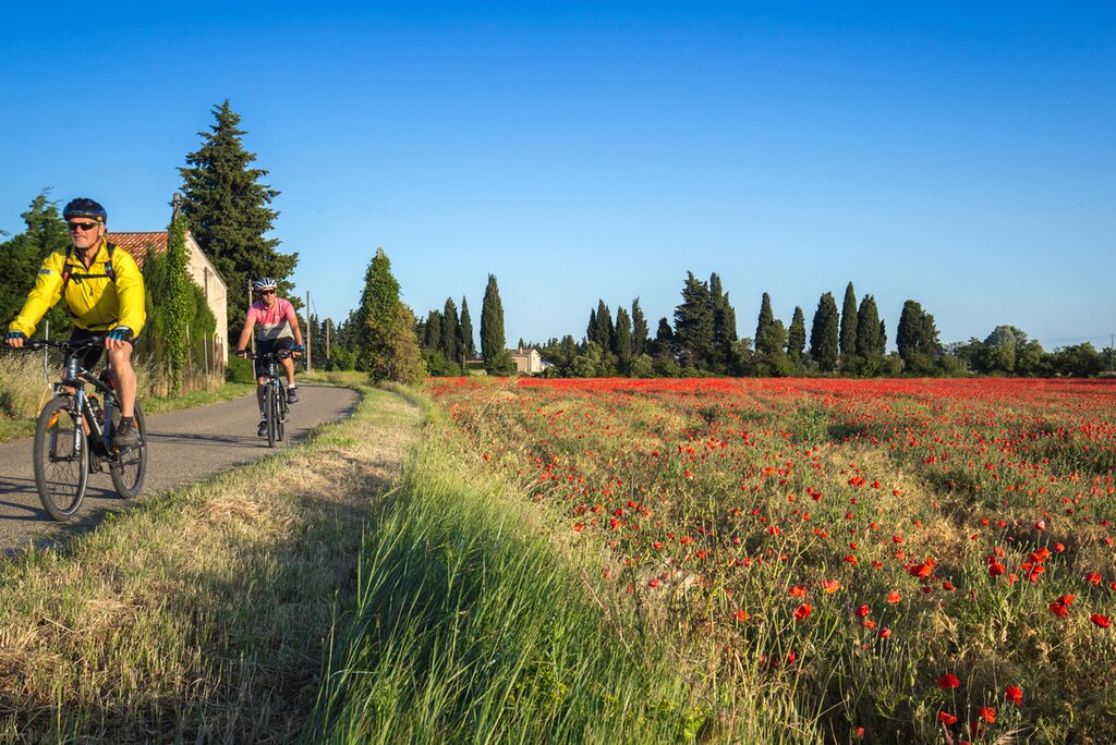 <Heute ist ein langer Tag im Sattel, aber du wirst mit beeindruckenden Sehenswürdigkeiten auf dem Weg belohnt. Hoffentlich weht der berüchtigte Mistral aus Nordwesten und sorgt für Rückenwind auf dem Weg nach Saint Remy. Auf der Rückfahrt über die Rhone fährst du unter dem alten Stadttor hindurch in die kleine Stadt Tarascon. Lege eine kurze Pause ein, um die imposante mittelalterliche Burg zu besichtigen, bevor du dich am Flussufer niederlässt, um etwas über die Legende von Tarasque, dem Namensgeber der Stadt, zu erfahren. Nach dem Mittagessen fährst du weiter nach Saint-Remy-de-Provence. Im Gegensatz zu den umliegenden größeren Städten zeigt Saint Remy eine typisch provenzalische Lebensart. Besuche die ruhigen Gärten des Saint-Paul-Asyls, in dem Vincent van Gogh als Patient lebte und in dem er viele Kunstwerke malte, darunter die "Schwertlilien" und die berühmte "Sternennacht".