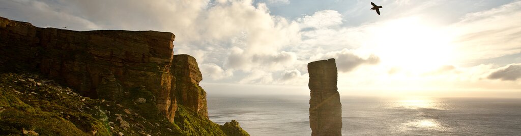 <Nach dem Frühstück fahren wir nach Houton und nehmen die Fähre zur Insel Hoy, der zweitgrößten Insel der Orkney-Inseln. Hoy war in beiden Weltkriegen der wichtigste Marinestützpunkt für die britische Flotte, wobei Scapa Flow bei Lyness eine Schlüsselposition einnahm. Heute besuchen wir das berühmte Scapa Flow Museum, das eine beeindruckende Sammlung von Artefakten aus diesem historischen Ort beherbergt. Nimm dir Zeit, die Ausstellungsstücke zu besichtigen, und wenn du möchtest, kannst du an einer optionalen Küstenwanderung teilnehmen, bei der du einen atemberaubenden Blick zurück auf das Orkney-Festland hast. Am frühen Nachmittag kehren wir mit der Fähre nach Kirkwall zurück, so dass du den Rest des Tages zur freien Verfügung hast, um zu entspannen oder etwas zu erkunden. Später kannst du in das reiche kulturelle Erbe Orkneys eintauchen, indem du die Atmosphäre genießt und dich vielleicht deinem Reiseleiter zu einer Whiskyverkostung anschließt, bei der außergewöhnliche Malts von Orkney und darüber hinaus verkostet werden. -