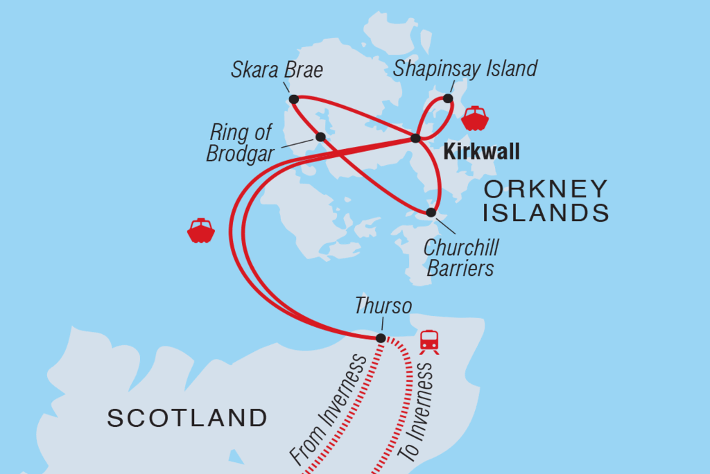 <Willkommen in Schottland und in Inverness, der Hauptstadt der schottischen Highlands. Diese pulsierende Stadt ist bekannt für ihre reiche Geschichte, ihre landschaftliche Schönheit und die Nähe zum Loch Ness. Anstatt nach Nessie zu suchen, triffst du heute deinen örtlichen Reiseleiter und deine Mitreisenden am Bahnhof von Inverness, um deine Reise zu den Orkney-Inseln zu beginnen. Mit dem Zug geht es nach Thurso, wo wir zum nahegelegenen Hafen von Scrabster fahren und dort die Fähre nach Orkney besteigen. Lehn dich zurück, entspanne dich und genieße dein Abendessen, während du den atemberaubenden Blick auf den Old Man of Hoy, den höchsten Seestapel Großbritanniens, genießt. Nach der Ankunft in Stromness nehmen wir einen privaten Transfer nach Kirkwall, dem Hauptort der Insel. Nach der langen Fahrt kannst du dich in deiner Unterkunft einrichten. Wenn du dir die Beine vertreten und dich orientieren möchtest, kannst du im Stadtzentrum spazieren gehen oder einen Drink genießen.