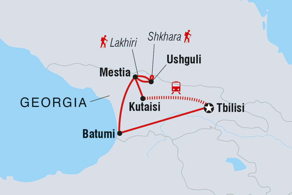 Auf diesem neuntägigen Abenteuer reist du von den modernen Städten Georgiens in die abgelegenen schneebedeckten Berge des Kaukasus. Erkunde die historische Hauptstadt Tiflis, schlendere über den lokalen Markt in Kutaisi, lerne die Geheimnisse der georgischen Käseherstellung kennen und verwöhne deine Geschmacksnerven mit duftendem georgischem Wein. Besuche Mzcheta und lausche den Überlebens- und Wiederbelebungsgeschichten von Ikorta, verbringe eine Nacht in einem lokalen Gästehaus in Mestia und begib dich auf eine Wanderung durch das höchstgelegene Dorf Europas - Uschguli.