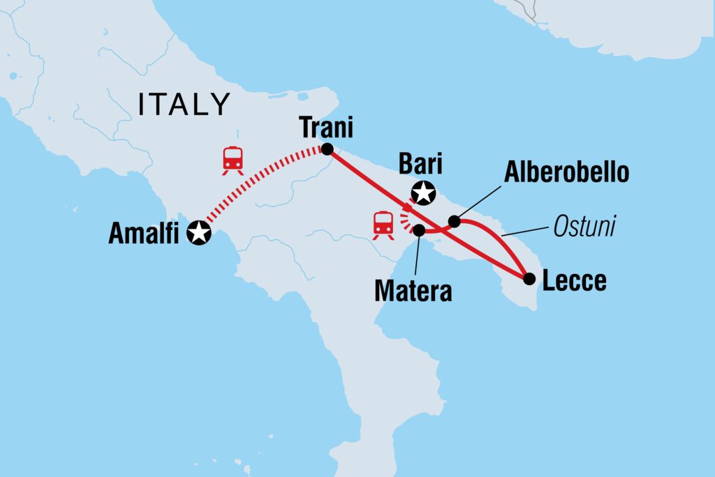 Begib dich auf eine unvergessliche Reise entlang Italiens selten besuchtem Absatz und lerne eine andere Seite dieses wunderschönen Landes kennen. Bewundere die Schönheit von Amalfi, entspanne dich stilvoll in Trani und besuche die römischen Ruinen, barocken Kirchen und weiß getünchten Gassen von Lecce. Spaziere zwischen den eigenwillig geformten Häusern von Alberobello, durchstreife die Hügelwohnungen von Matera und entdecke das Leben in der Altstadt von Bari rund um die Basilica di San Nicola. Mach dich auf den Weg und sag ciao zu Italiens südlichstem Stück der Adria.