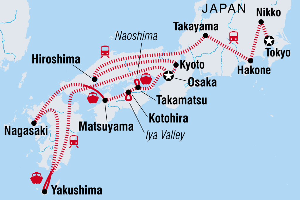 Entdecke auf diesem 23-tägigen Abenteuer durch Japan einige der besten Sehenswürdigkeiten und kulturellen Schätze. Fahre mit der malerischen Hakone-Seilbahn, wandere durch das Hida-Volksdorf in Takayama und erfahre etwas über die ernüchternde Vergangenheit von Hiroshima. Besuche das schwimmende Torri-Tor auf der Insel Miyajima, biege von der Hauptinsel Honshu in den naturbelassenen Südwesten ab und spaziere durch kunstvolle Schlösser. Verbringe eine Nacht in einer ruhigen Gastfamilie in Usuki, entspanne dich im Dampf des Onsen von Beppu und genieße die Ruhe in der Caldera des Mt. Aso in einem traditionellen japanischen Gasthaus, das von Reisterrassen umgeben ist. Besuche den Friedenspark in Nagasaki, genieße traditionelle Gerichte und probiere einheimischen Sake auf dem Weg.