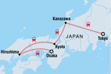 Sag "Konnichiwa" zu Japan - einem vielfältigen Land voller Kultur, Innovation und Küche. Mit deiner neuen Gruppe von Freunden kannst du in Tokio Sushi essen und shoppen, bevor du in Kanazawa die verrückte Samurai-Kultur kennenlernst (hier kannst du auch ein paar Gläser Sake trinken). Spaziere durch wunderschöne Gärten und Tempel und lerne dann in Hiroshima im Friedenspark und -museum etwas über die Weltgeschichte. Beobachte Geishas in Kyotos Stadtteil Gion und singe Beyonce in einer Karaoke-Bar in Osaka. Du hast außerdem jede Menge Freizeit, um deine Reise mit Aktivitäten zu gestalten, die du alleine oder mit deinen neuen Freunden unternehmen möchtest, damit du nichts auf deiner Bucket List verpasst.