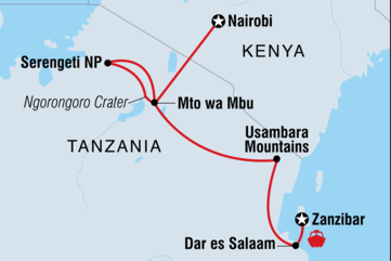 Reise auf dem Landweg auf einer 12-tägigen Reise durch das östliche Afrika bis nach Sansibar. Egal, ob du Löwen in der Serengeti beobachtest, auf einem üppigen Bergpfad in den Usambara-Bergen wanderst, auf einer traditionellen Dhau durch das azurblaue Wasser des Indischen Ozeans schipperst oder dich mit den einheimischen Gemeinschaften in der Nähe von Mto wa Mbu unterhältst, du wirst einiges über die Wunder dieses Landes und seiner Menschen lernen. Begleite einen erfahrenen einheimischen Reiseleiter und eine Gruppe gleichgesinnter Abenteurer, die jeden Zentimeter des Ngorongoro-Kraters nach den Big Five absuchen und bei einem Meeresfrüchte-Essen in Sansibar Reisegeschichten austauschen wollen.