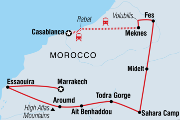 Wenn du auf der Suche nach einem zweiwöchigen Abenteuer voller Highlights in Marokko bist, ist diese Reise genau das Richtige für dich! Von heiligen Stätten über belebte Medinas bis hin zu den Weiten der Sahara - du wirst alle beliebten Hotspots besuchen und in einigen der schönsten Landschaften des Landes eine Pause einlegen. Schlendere durch die Gassen der blauen Stadt Chefchaouen, erkunde die römischen Ruinen von Volubilis und entdecke das kulturelle Herz Marokkos in Fes. Fahre durch abwechslungsreiche Landschaften (halte Ausschau nach Berberaffen und nomadischen Hirten), reite auf einem Kamel dem Sonnenuntergang in der Wüste entgegen, wandere durch üppige Palmenhaine im Todra-Tal, entdecke beliebte Drehorte im zum Weltkulturerbe zählenden Ait Benhaddou, entspanne dich am Meer in Essaouira und genieße zum Abschluss die Straßenbasare und Künstler auf dem Djemaa el-Fna in Marrakesch.
