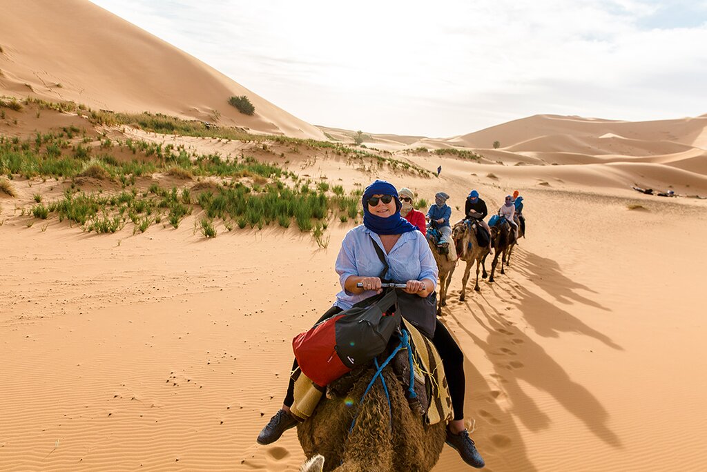 Die heutige Reisezeit beträgt etwa 8 Stunden, davon 2,5 Stunden in den Geländewagen. Der Kameltrek durch die Sahara ist ein Höhepunkt der Reise, aber wenn du möchtest, kannst du stattdessen auch neben den Kamelen herlaufen. Die Fahrt dauert etwa eine Stunde. Wenn du nicht laufen oder auf einem Kamel reiten möchtest, kannst du stattdessen eine Fahrt mit dem Geländewagen organisieren. Diese kann direkt mit deinem Reiseleiter organisiert werden und kostet ca. 100MAD pro Person.Das Camp ist einfach, mit Bettzeug und einfachen gemeinsamen Toiletten. Zwischen April und Oktober sind die Decken warm genug, aber in den Monaten zwischen November und März solltest du dein eigenes Bettlaken oder deinen eigenen Pullover mitbringen, um es noch wärmer zu haben. Im Camp gibt es keinen Strom, daher solltest du mit voll aufgeladenen Handys, Kameras und allem, was du sonst noch brauchst, ausgestattet sein. -