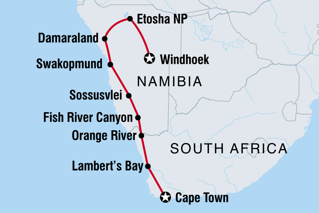 Erlebe ein Abenteuer voller Wildtiere in Namibia - einem der am dünnsten besiedelten Länder der Erde! Du überquerst die Grenze zu Südafrika und reist entlang der wunderschönen Küste Namibias, zu Sanddünen, Mondlandschaften und Savannen, in denen es von wilden Tieren nur so wimmelt. Dies ist ein Land der Kontraste und ein Paradies für Naturliebhaber! Wandere durch die Wüste, genieße einheimische Gerichte und entspanne dich an selten besuchten Stränden. Genieße afrikanische Sonnenuntergänge, beobachte Vögel und gehe auf Pirschfahrten durch den Etoscha-Nationalpark - und das alles mit einem einheimischen Führer, der dir faszinierende Einblicke gewährt.