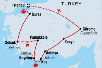 Erlebe die türkischen Köstlichkeiten auf einem 15-tägigen Abenteuer ab Istanbul. Diese Reise ist eine Mischung aus antiken Ruinen und modernen Städten, islamischer Geschichte und osmanischem Einfluss, Entdeckungen im Landesinneren und Kreuzfahrten an der Küste - und alles dazwischen! Entdecke Gallipoli auf einer geführten Tour, die dich über seine Bedeutung im Ersten Weltkrieg aufklärt, lüfte die Geheimnisse der antiken Stadt Ephesus, bewundere Oludeniz' Blaue Lagune von hoch oben auf dem Lykischen Weg und schwimme im Mittelmeer auf einer traditionellen Gulet-Kreuzfahrt ab Kas. Von den verwinkelten Gassen von Istanbuls Großem Basar bis hin zu den bizarren Landschaften Kappadokiens - du wirst die Türkei von ihrer einheimischen Seite kennenlernen.